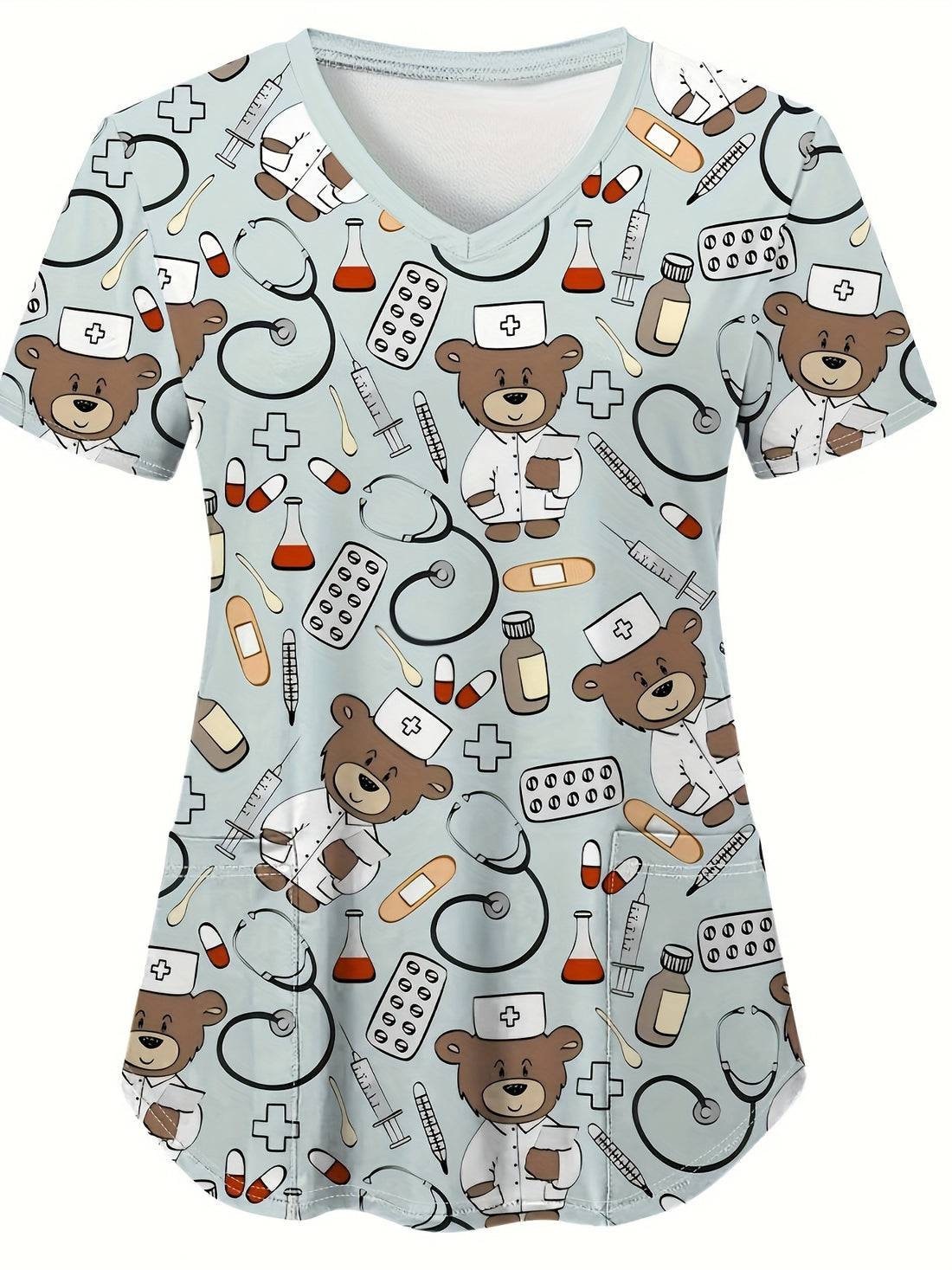 Comfortable Cartoon Bear Doctor Pattern Print Women's V-Neck Short-Sleeve Nurse Top - Nurse Work Uniform